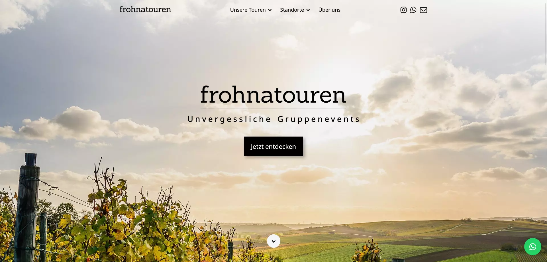 Es war uns eine Freude frohnatouren bei der Umsetzung der Webseite zu begleiten. Lars war es wichtig, dass die Webseite authentisch wirkt und eine Möglichkeit zur Buchung seiner Weintouren bietet. Umgesetzt haben wir das Projekt mit WordPress und einem Online-Buchungstools mitsamt Google Kalender-Integration sowie einer automatisierten Online-Zahlung mit dem Zahlungsdienstleister Stripe.
